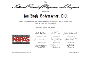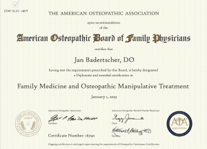 Dr. Badertscher or Dr. Jan, completed her medical school training at Touro University Nevada College of Osteopathic Medicine in Henderson, Nevada. She completed an Osteopathic Family Medicine/OMM Residency program in Miami, Florida. She is Board Certified in Osteopathic Family Medicine and Osteopathic Manipulative Medicine. Dr. Jan has continued her training and education since Residency in numerous Allopathic and Osteopathic skills including Male and Female Hormone Replacement Therapy and Health, Thyroid and Adrenal therapies, Cranial Therapy, and Regenerative Medicine.